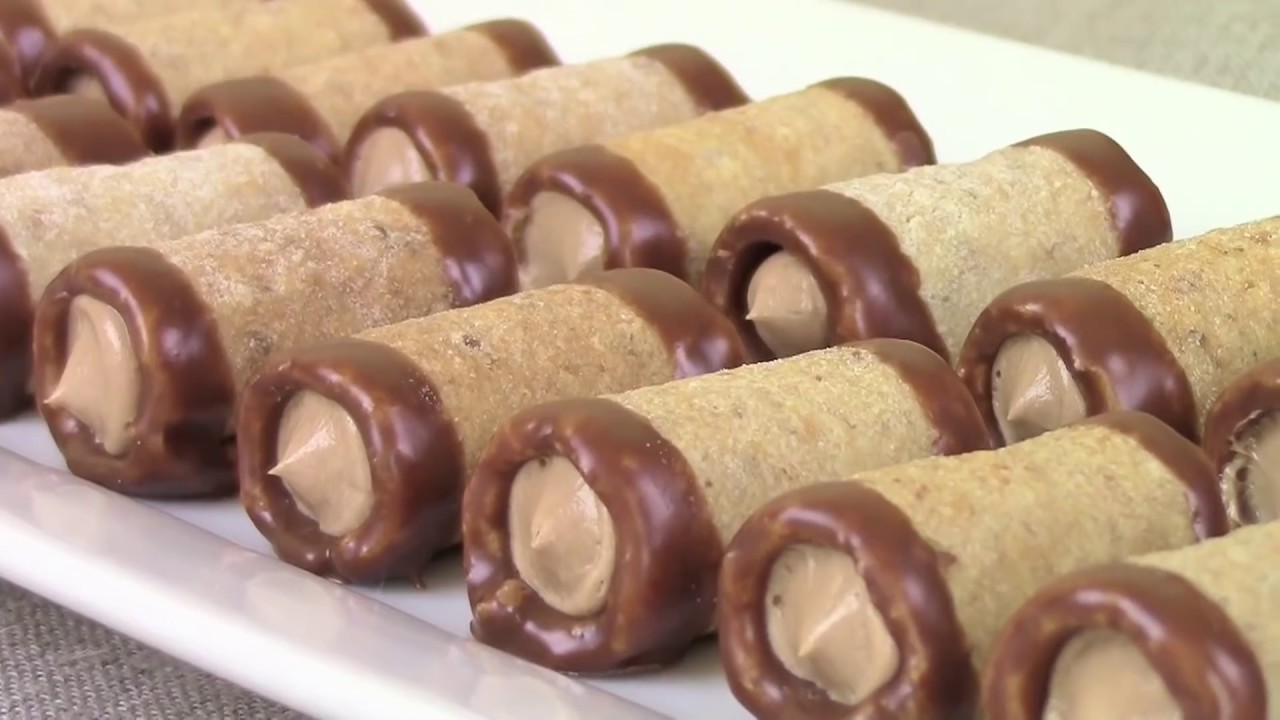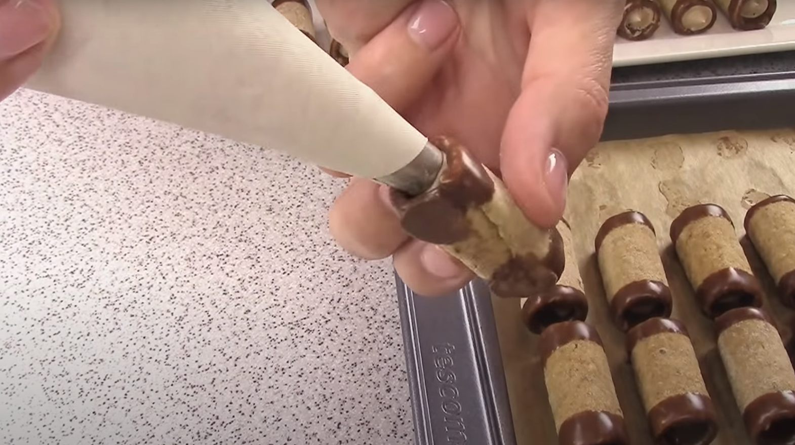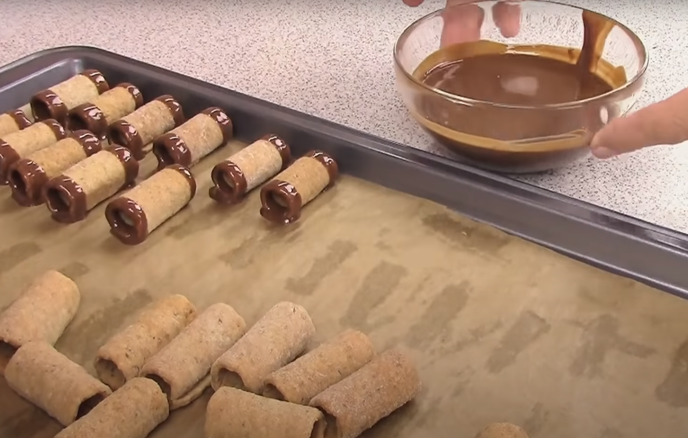 Zanurz oba końce w polewie czekoladowej, ułóż na papierze do pieczenia i pozwól mu stwardnieć.