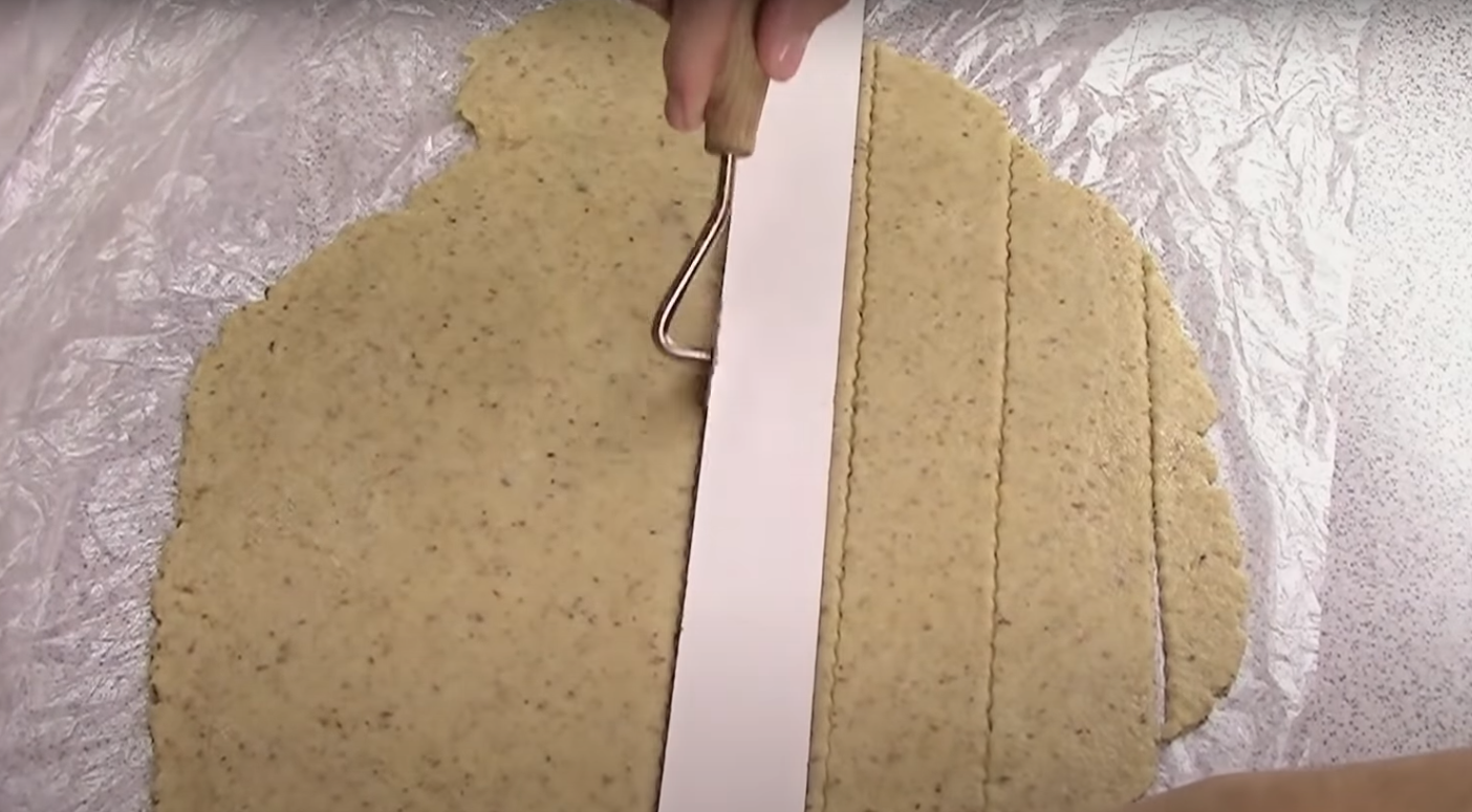 Metalowe foremki posmaruj masłem i rozwałkuj ciasto na blacie między posypaną mąką folią lub papierem do pieczenia. Pociąć na równe paski (możemy użyć szablonu).