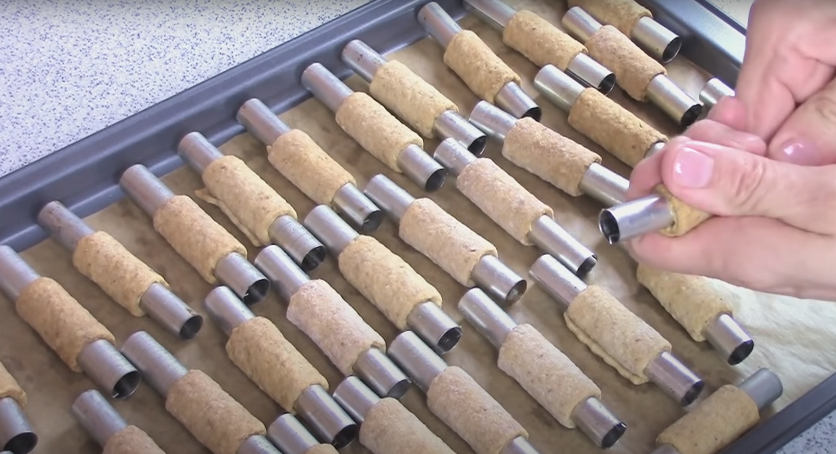 Paski ciasta nawijamy na metalowe foremki, odcinamy odpowiednią część, dobrze dociskamy i układamy na blasze wyłożonej papierem do pieczenia. Pieczemy w piekarniku nagrzanym do 170°C przez około 20 minut. Z tej partii powstanie około 80 sztuk. Po upieczeniu wyjmij rurki z foremek.
