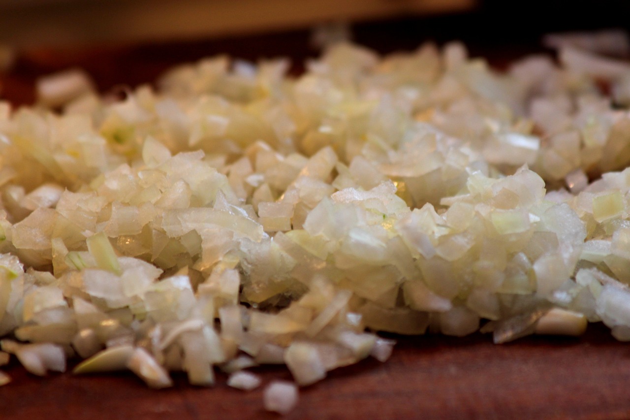 Dodaj posiekaną cebulę. Zanim cebula zacznie brązowieć. Dodajemy więc pierś z kurczaka pokrojoną na kawałki.