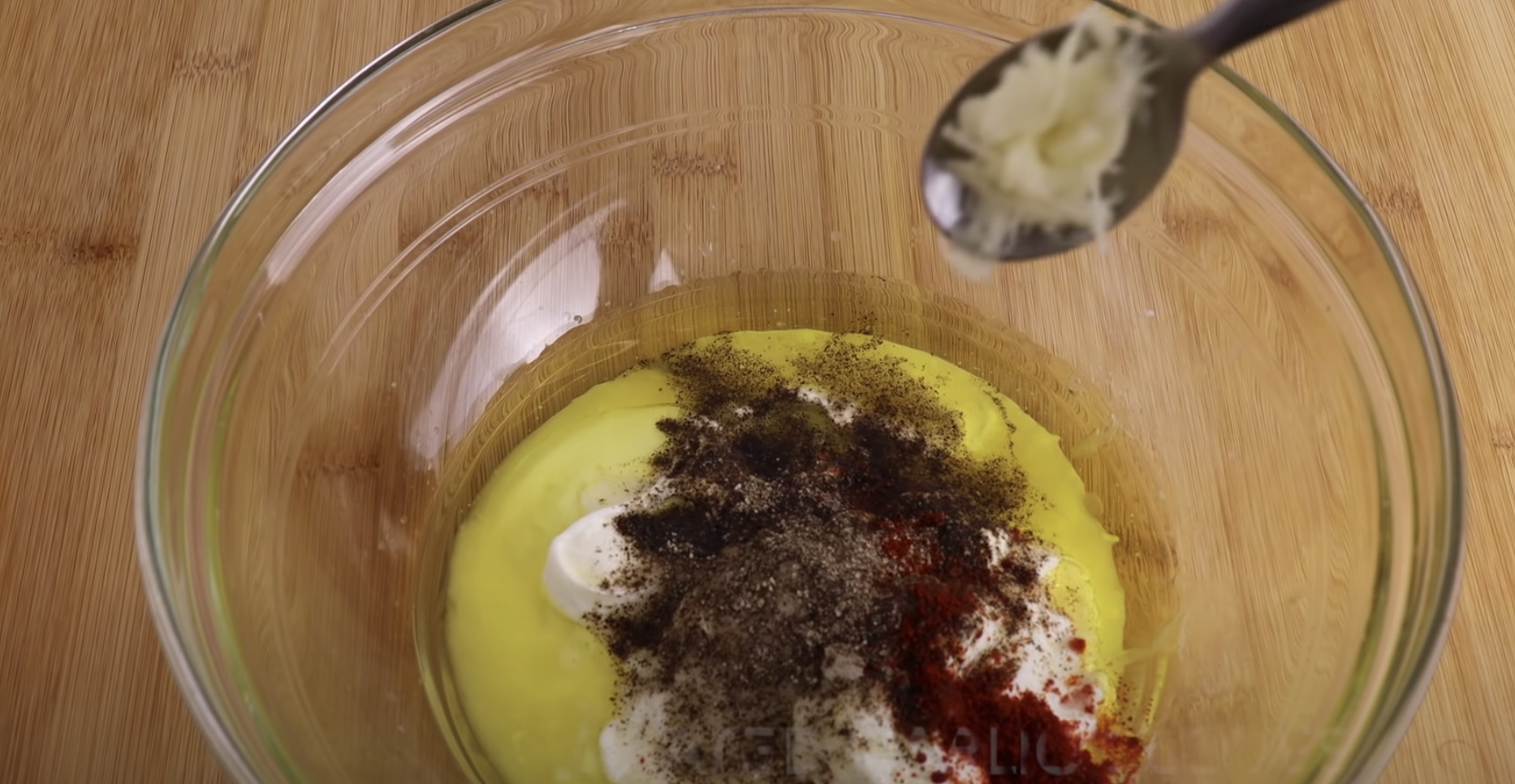 Do miski dodaj: oliwę, jogurt i czosnek przeciśnięty przez praskę. Dodaj łyżkę musztardy, a następnie dopraw solą i pieprzem do smaku. Wszystko dokładnie wymieszaj tworząc jednolitą masę.