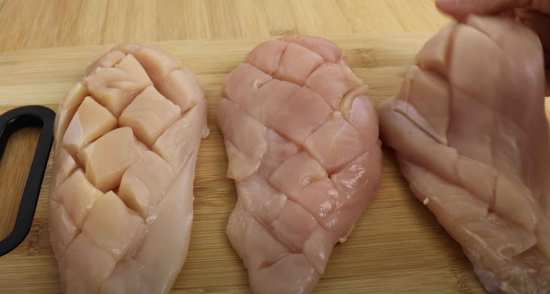 Pokrój mięso na wzór siatki na głębokość 3/4 piersi. Pamiętaj, żeby nie rozcinać kawałka mięsa do końca.