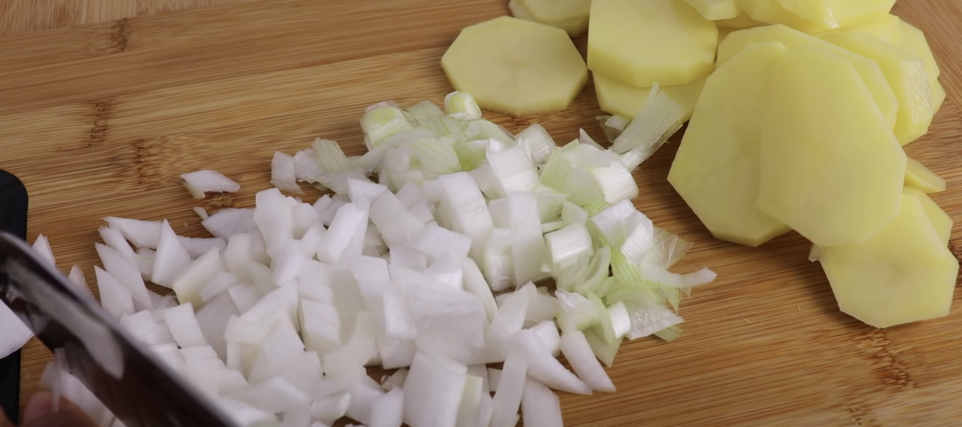 Włącz piekarnik na 180 stopni z termoobiegiem i przygotuj blachę do pieczenia. W tym czasie odbierz i pokrój: ziemniaki, cebulę i pieczarki. Najlepiej w plastry, bądź półokręgi.