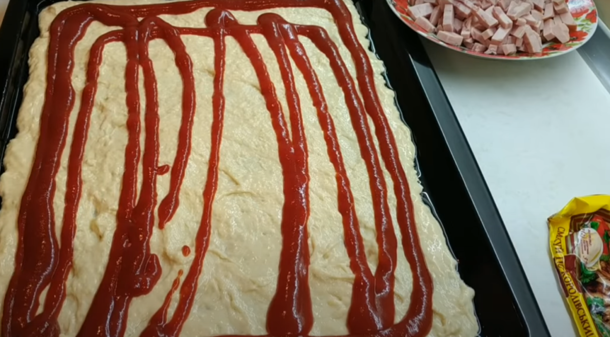 Blachę do pieczenia natłuść lub wyłóż pergaminem. Równomiernie rozłóż na niej ciasto i posmaruj je sosem pomidorowym. Teraz możesz umieścić na pizzy wybrane dodatki.