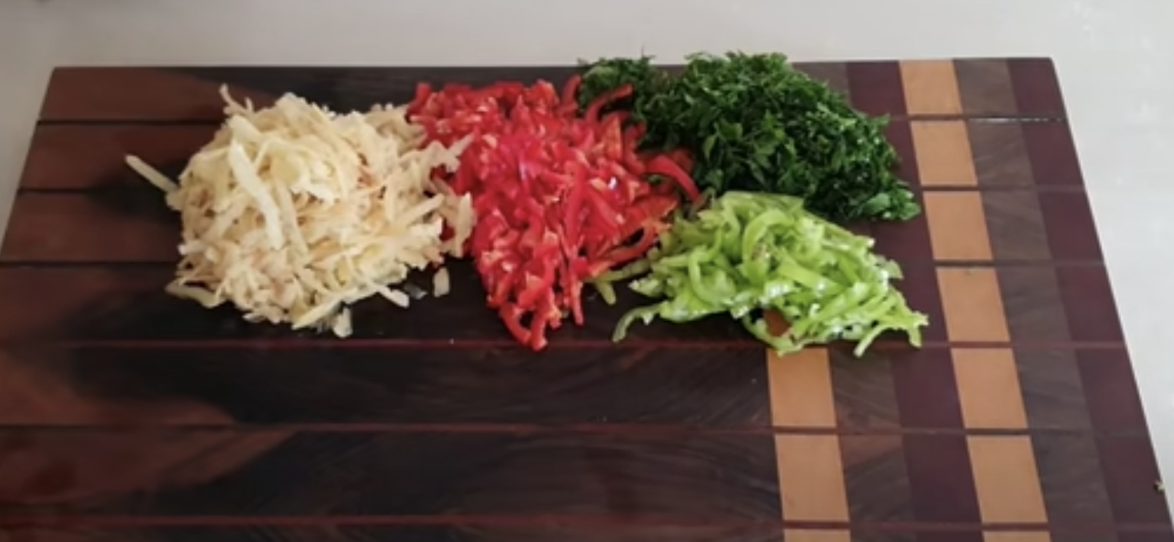Ziemniaka obieramy i ścieramy na tarce. Odciskamy z nadmiaru wody. Papryki i pietruszkę drobno siekamy.