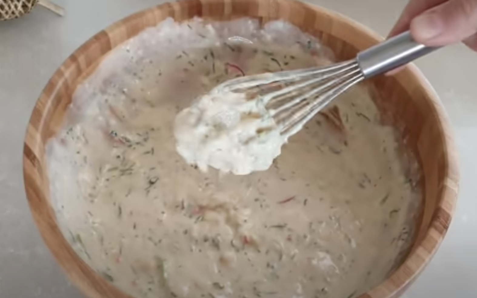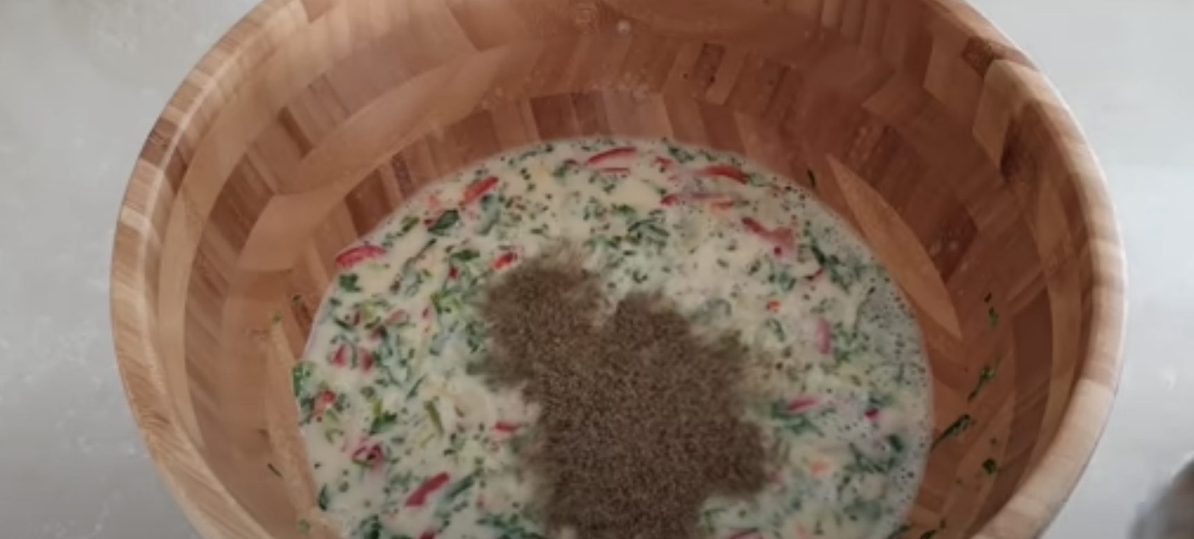 Następnie dodajemy jajka i przygotowane wcześniej warzywa. Wszystko doprawiamy do smaku solą, pieprzem i mieszamy łyżką.