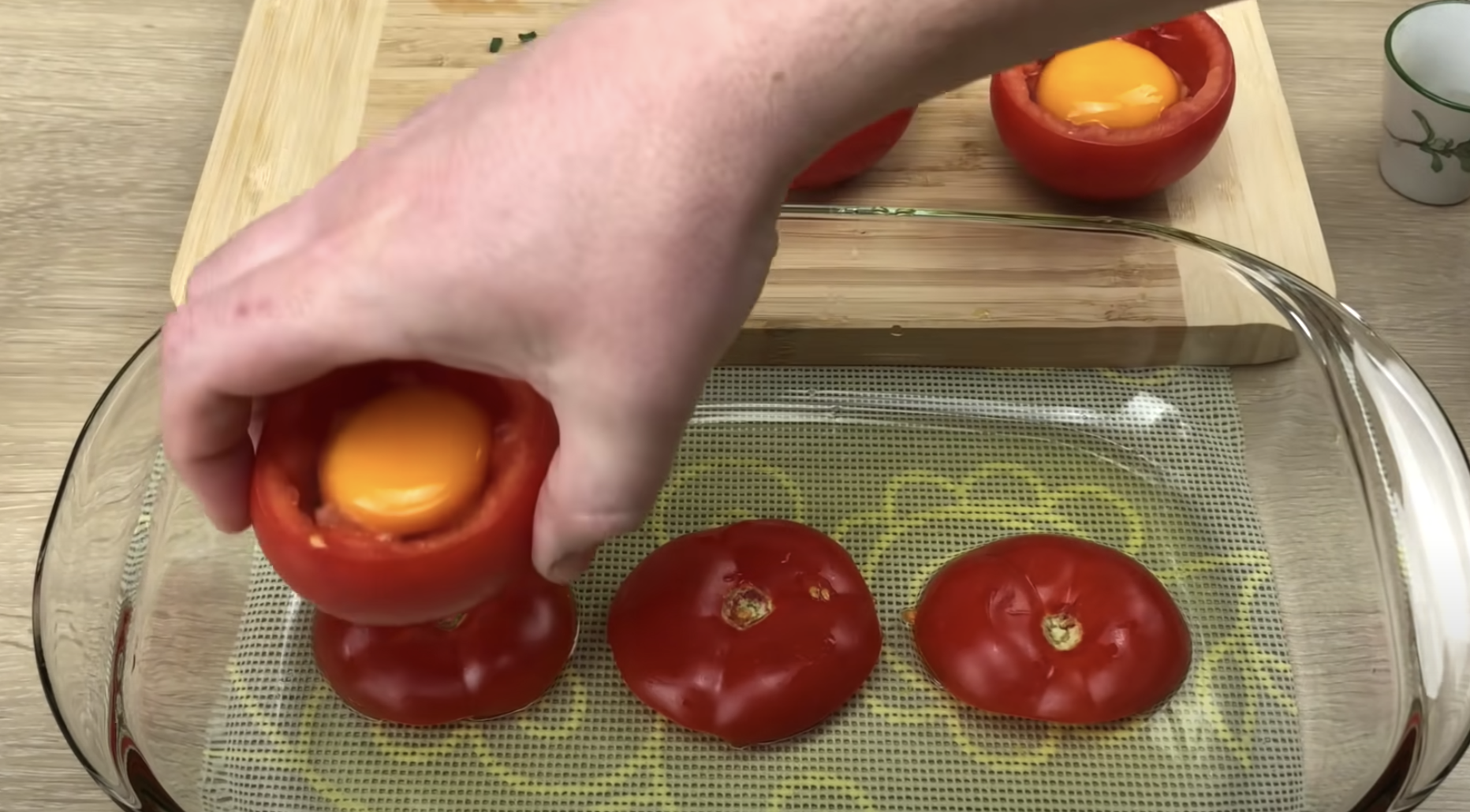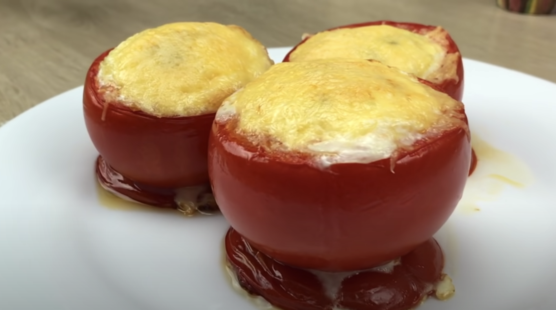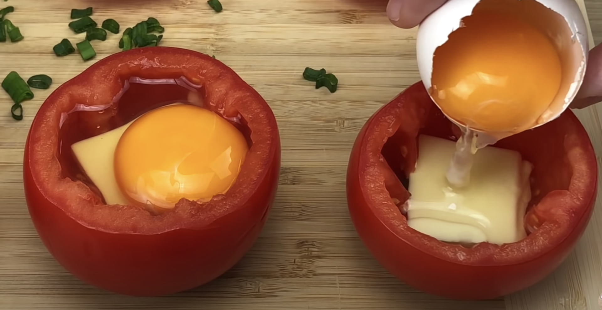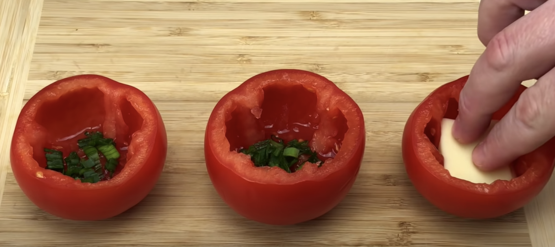 Wsyp posiekany szczypiorek do pomidorów. Umieść w każdym po kawałku sera.