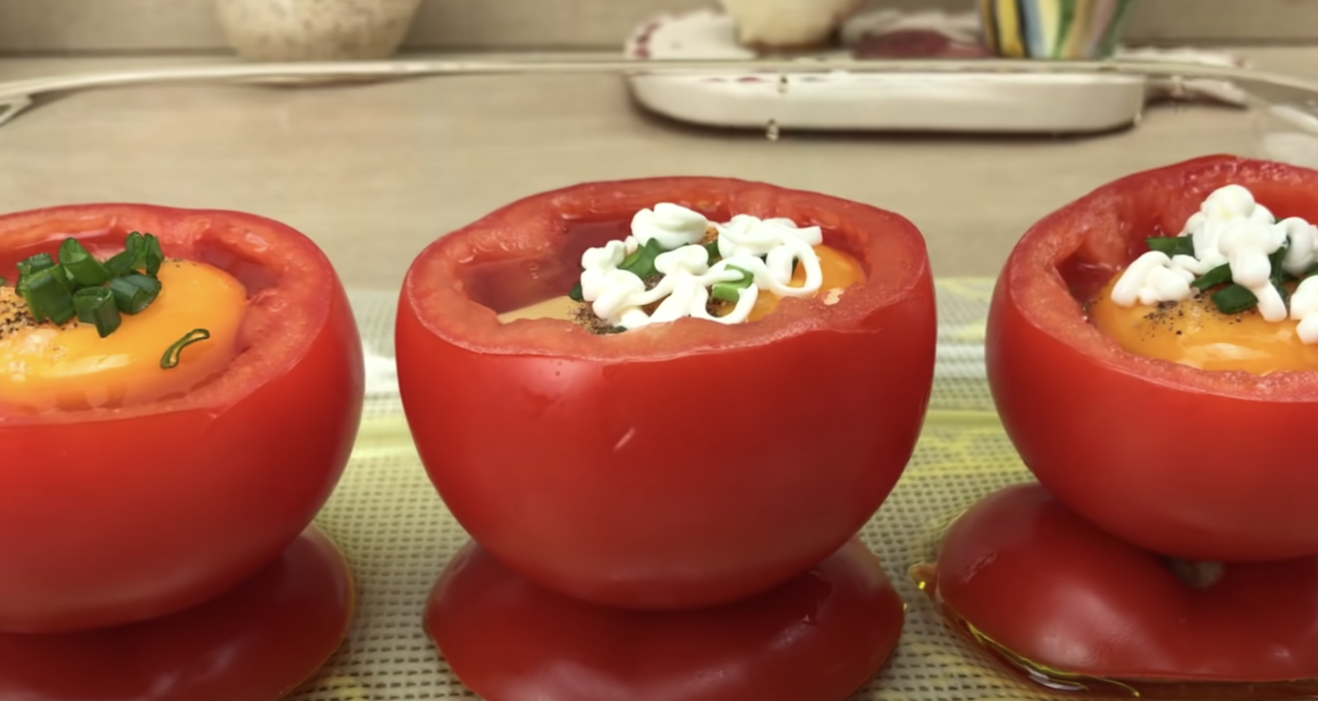 Ułóż w niej odkrojone góry od pomidorów, a na nich nadziane pomidory. Połóż trochę majonezu na wierzchu.
