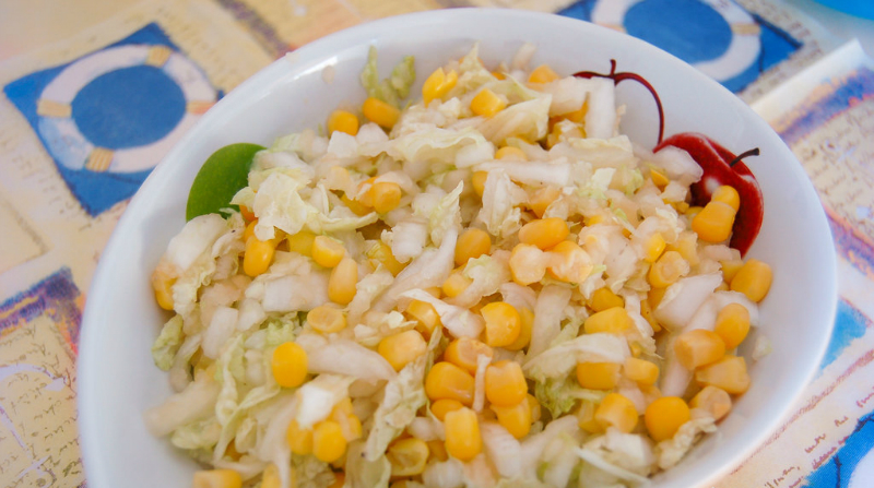 Kapustę cienko siekamy. Oba jabłka kroimy w cienkie plasterki lub paseczki. Dodajemy kukurydzę i mieszamy. Całość skrapiamy octem jabłkowym, olejem i doprawiamy solą oraz pieprzem.
