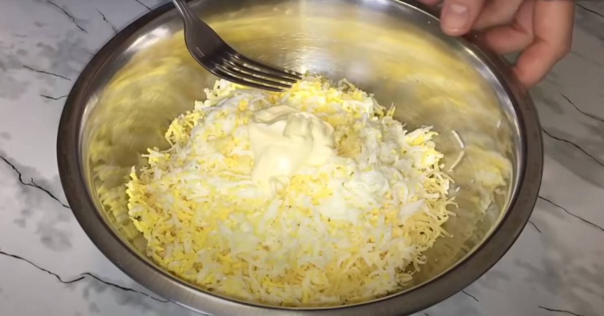 Pozwól jajkom gotować się przez co najmniej 20 minut, następnie ostudź je, a potem drobno zetrzyj ser. Doprawić solą. Wymieszaj majonez z czosnkiem.