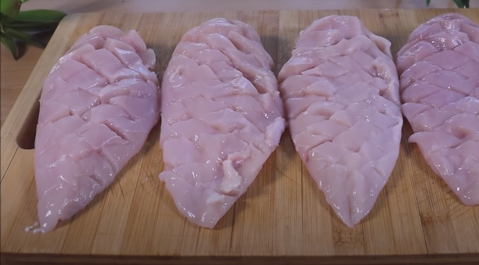 Następnie przygotuj pierś z kurczaka. Każdą pierś naciąć na kształt kratki.