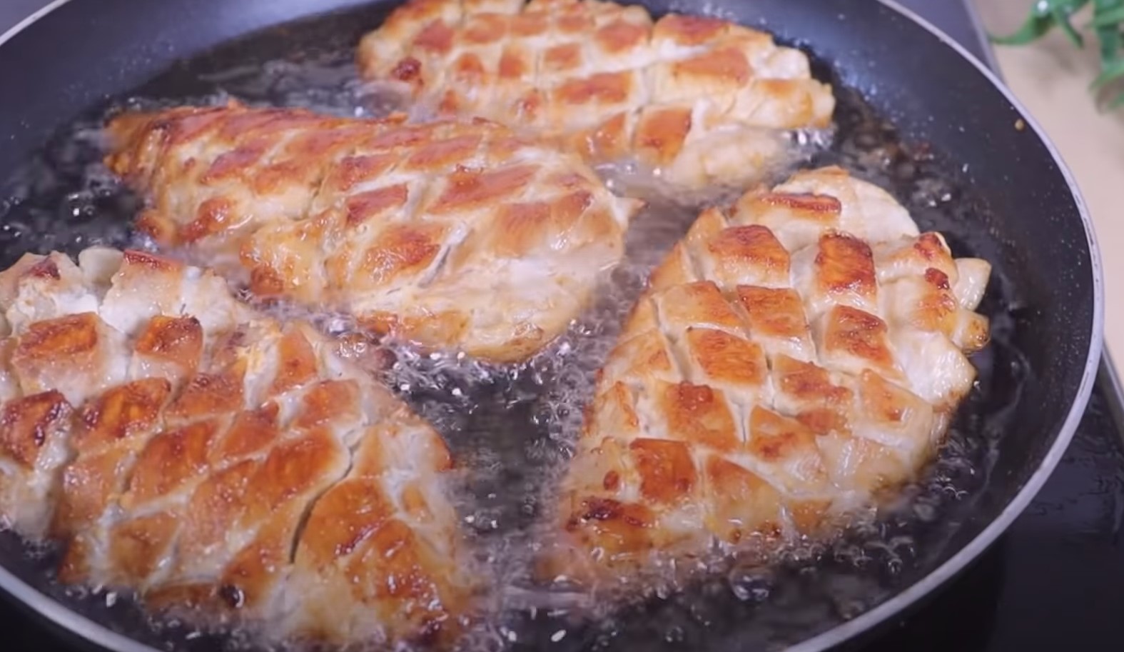 Na dużej patelni rozgrzać olej i usmażyć piersi kurczaka na złoty kolor.