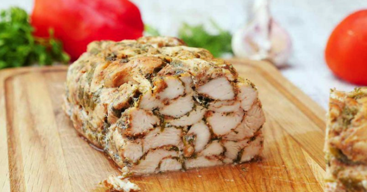 Fileta należy pokroić na niewielkie kawałki i przenieść do głębokiego pojemnika. Przyprawić je mieloną papryką, czarnym pieprzem i solą. Po dokładnym wymieszaniu mięsa z przyprawami dodać czosnek, żelatynę i drobno posiekane zioła. Całość ponownie wymieszać.