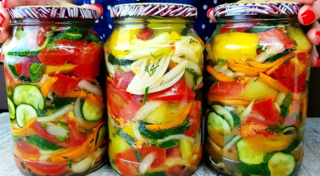 Zakręć pokrywkami. Wlej ciepłą wodę do garnka, ułóż na jego dnie bawełniany ręcznik, a na nich słoiki. Sterylizuj od momentu wrzenia przez 25 minut. Po tym czasie odwróć słoiki do góry dnem i zawiń w ciepły koc do ostygnięcia. Sałatkę przechowuj w piwnicy lub spiżarni.