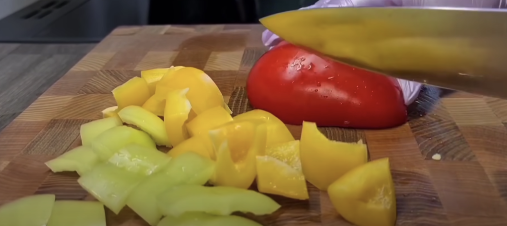 Paprykę słodka w paski, pikantną – w małe kawałki.