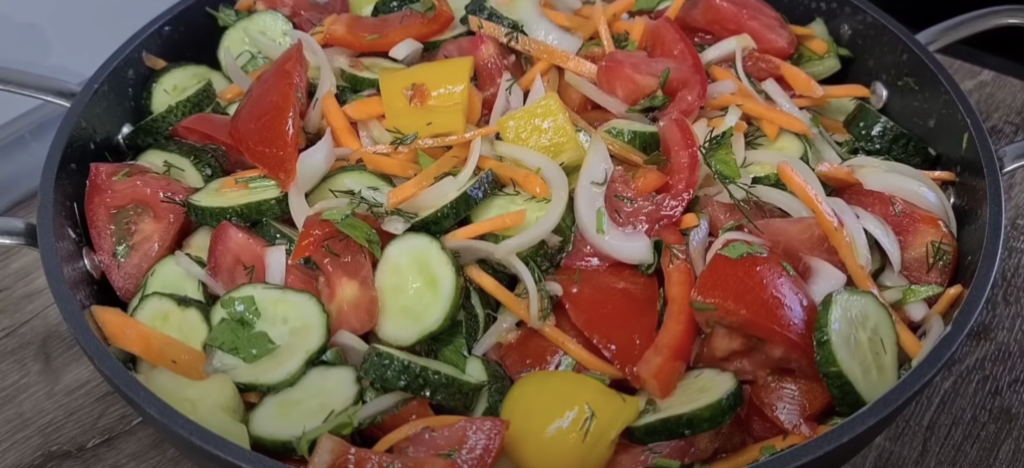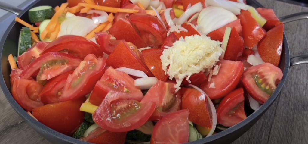 Pokrój pomidory na plasterki. Wymieszaj wszystkie warzywa w dużym pojemniku, dodaj posiekany czosnek, zioła, sól, cukier, olej roślinny.