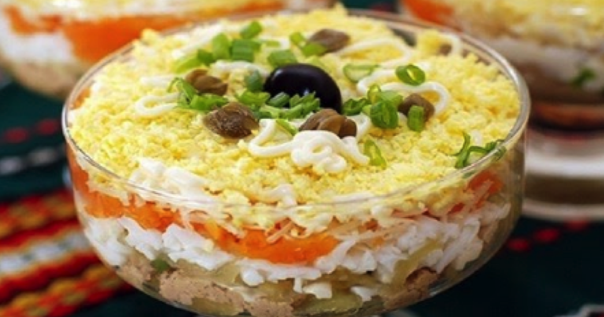 Piersi z kurczaka umyj i obierz ze skóry. Ugotuj je i odłóż do ostudzenia. Jajka ugotuj na twardo. Marchewki umyj, obierz i zetrzyj na tarce o grubych oczkach. Posiekaj drobno cebule, a grzyby pokrój w plastry.