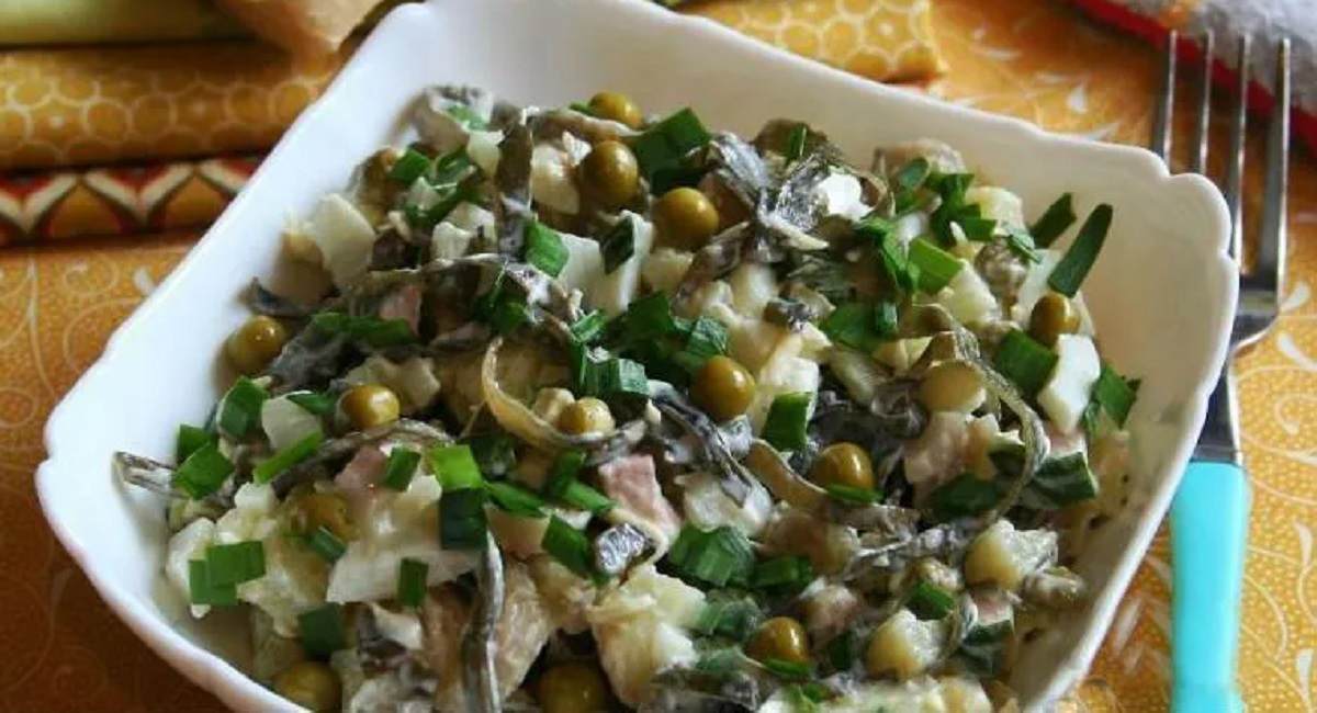 Jajka i ziemniaki ugotować, obrać i pokroić w kostkę. Drobno posiekaj zieloną cebulę. Wymieszaj jajka, ziemniaki i cebulę, dodaj groszek i wodorosty. Dopraw sałatkę majonezem, solą i pieprzem.