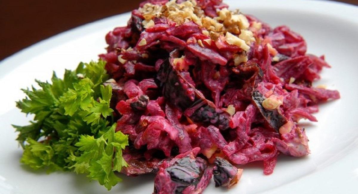 Opłucz i obierz buraki. Posyp plastry solą i cukrem, włóż buraki do piekarnika na pół godziny w temperaturze 180 ° C. Zetrzyj schłodzone buraki na grubej tarce i włóż do salaterki. Posiekaj orzechy, pokrój suszone śliwki i zetrzyj ser. Wymieszaj wszystkie składniki i dopraw sałatkę kwaśną śmietaną. Dopraw solą do smaku i wymieszaj.