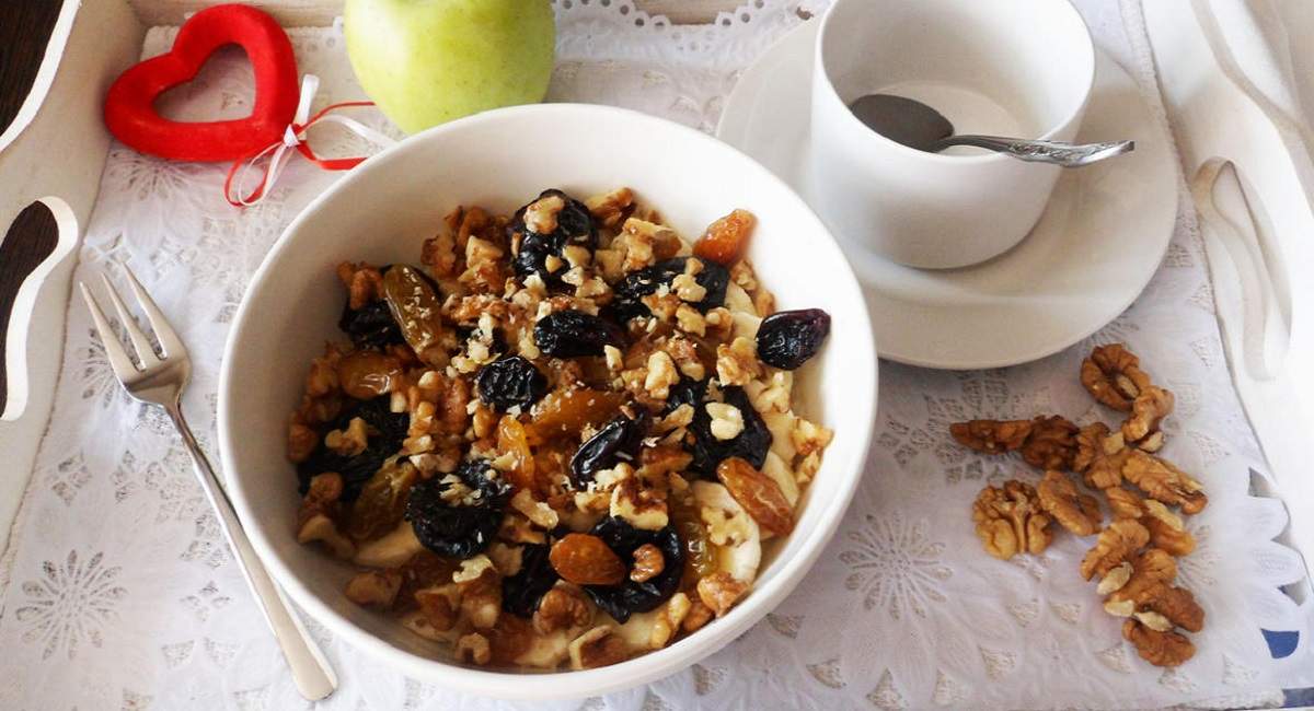 Płatki owsiane gotować na parze z wrzącą wodą. Rodzynki namoczyć i osuszyć, jabłko pokroić w kostkę, a orzechy posiekać nożem. Połącz wszystkie składniki i dopraw płynnym miodem.