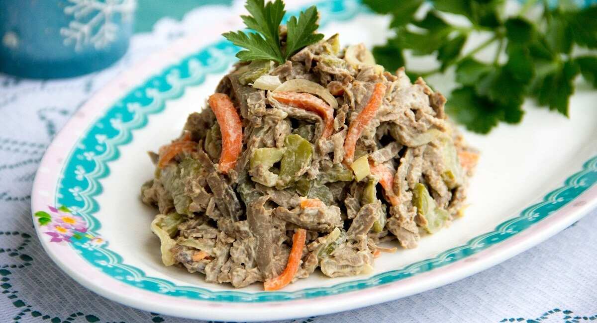 Wątróbkę wołową pokroić w kostkę i usmażyć na patelni na dużym ogniu. Cebulę obrać i pokroić w duże krążki, a marchewkę w kostkę. Smaż je oddzielnie od mięsa. Ogórek kiszony pokroić w paski. Wymieszaj składniki i dopraw sałatkę majonezem.