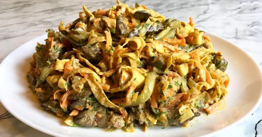 Wątróbkę wołową pokroić w kostkę i usmażyć na patelni na dużym ogniu. Cebulę obrać i pokroić w duże krążki, a marchewkę w kostkę. Smaż je oddzielnie od mięsa. Ogórek kiszony pokroić w paski. Wymieszaj składniki i dopraw sałatkę majonezem.