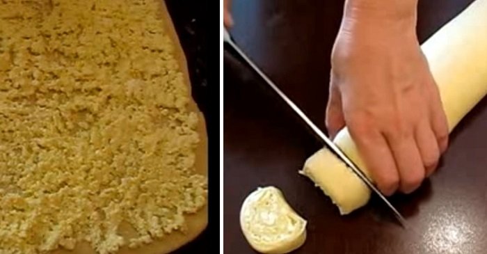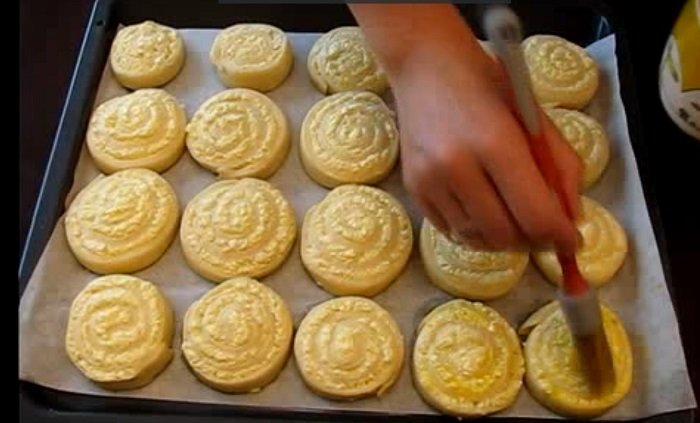 Przed pieczeniem posmarować roztrzepanym jajkiem. Ciastka należy piec do uzyskania złotego koloru w nagrzanym do 180 stopni piekarniku.
