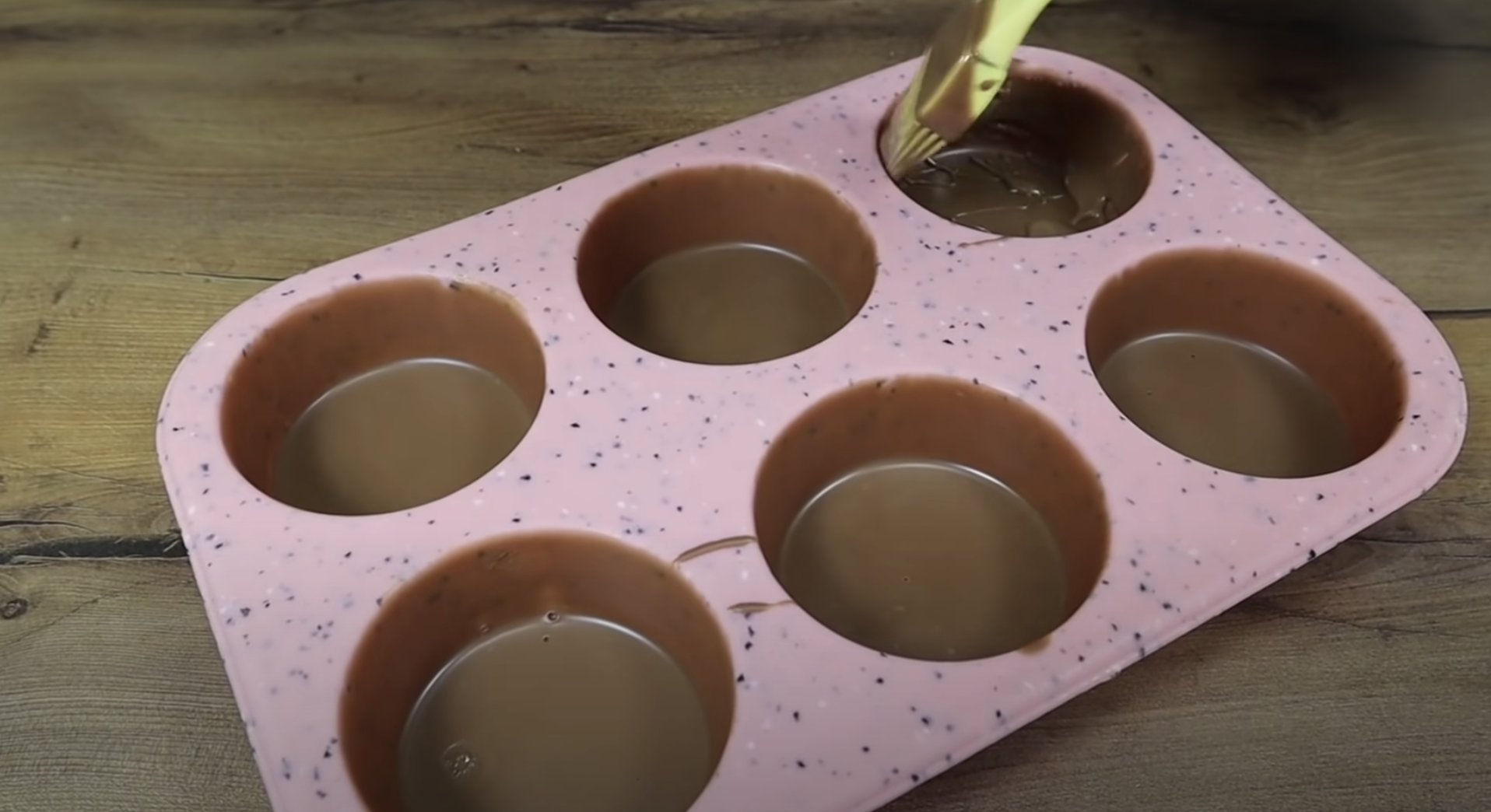 Przygotuj silikonową formę do muffinek. W każdym zagłębieniu rozprowadź cienką warstwę czekolady na pomocą pędzelka kuchennego tak, by pokryć również ścianki. Formę wstaw do zamrażarki na 10 minut.