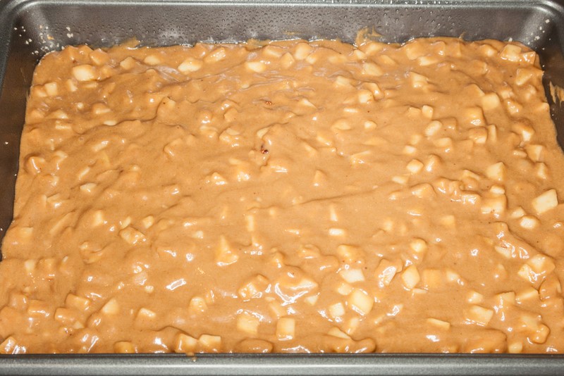 Wybraną foremkę do pieczenia wyłóż papierem do pieczenia lub wysmaruj masłem. Równomiernie rozłóż na foremce jabłka, a na wierzch wylej wcześniej przygotowane ciasto.