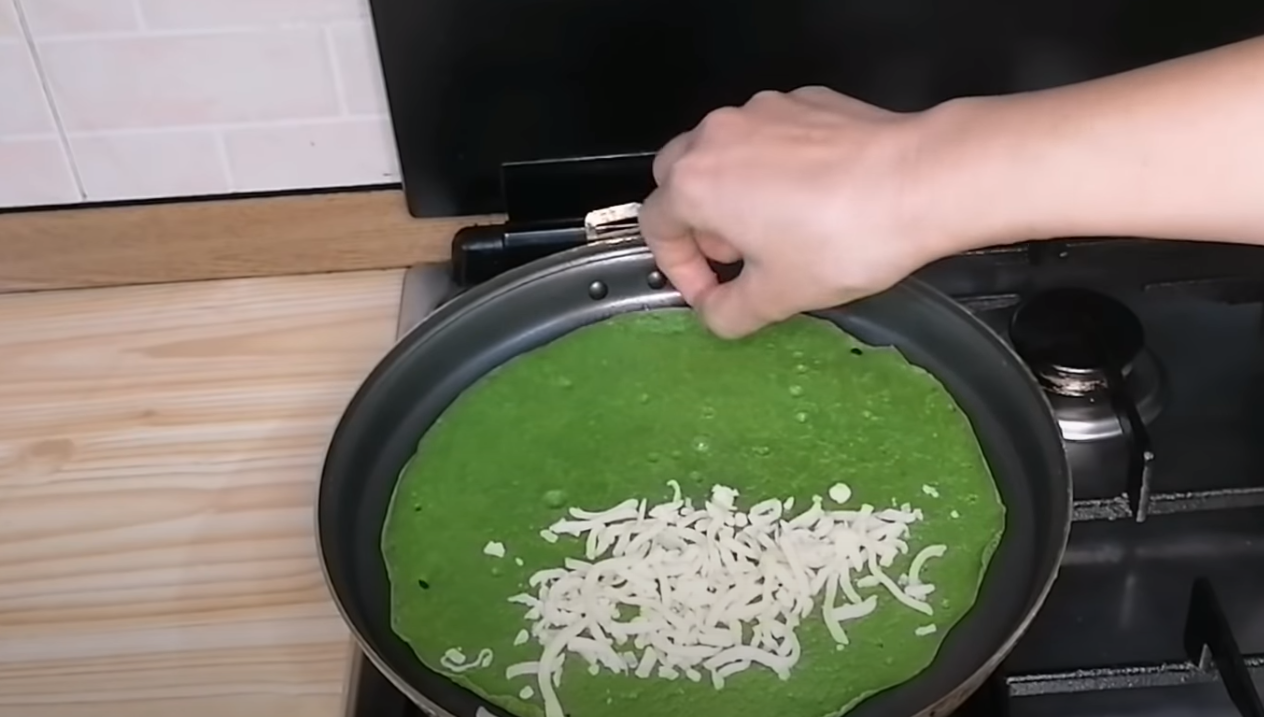 Gdy jedna strona placka będzie zarumieniona, posyp go serem i złóż na pół. Poczekaj, aż ser się rozpuści.