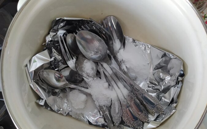 Oprócz tego potrzebne będą sztućce: łyżki, widelce, noże. Czyszczenie stalowych łyżek i widelców wymaga użycia wrzącej wody (od 1 do 1,5 litra). Będzie potrzebny głęboki garnek. Na jego dnie układamy jedną warstwę folii, na której umieszczamy sztućce, posypując je solą i sodą. Choć nie jestem pewna, jaka jest rola folii w tej metodzie, wiem, że bez niej proces nie działa.