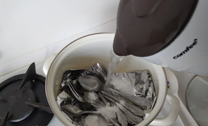 Ważne jest, aby użyć zwykłej soli, nie jodowanej, inaczej na łyżkach może pojawić się trudna do usunięcia biała powłoka. Po zagotowaniu wody, zalewamy nią sztućce. Soda zacznie intensywnie reagować z wrzątkiem, dlatego konieczne jest użycie głębokiego naczynia.