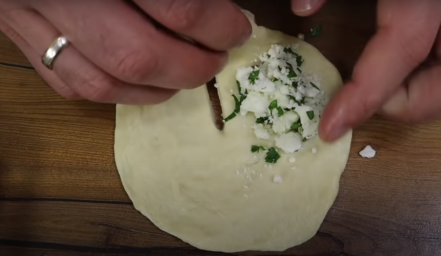 W tym samym czasie można pokroić zioła i wymieszać je z serkiem śmietankowym, chyba, że ktoś ma ochotę na inne nadzienie, to wszystko zależy od preferencji. Następnie ciasto należy uformować w długi rulon i podzielić je na mniejsze kawałki.