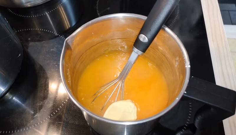 Wyciśnięty sok przelać do garnka, po czym dodać skrobie i cukier, mieszać używając trzepaczki, tak by pozbyć się ewentualnych grudek.