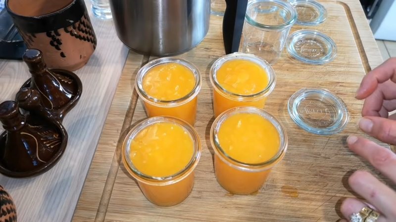 Mieszać, aż do momenty zagotowania, cały czas mieszając, po czym zmniejszyć ogień na minimalny i cały czas gotować, by uzyskać konsystencje średnio gęstego dżemu.