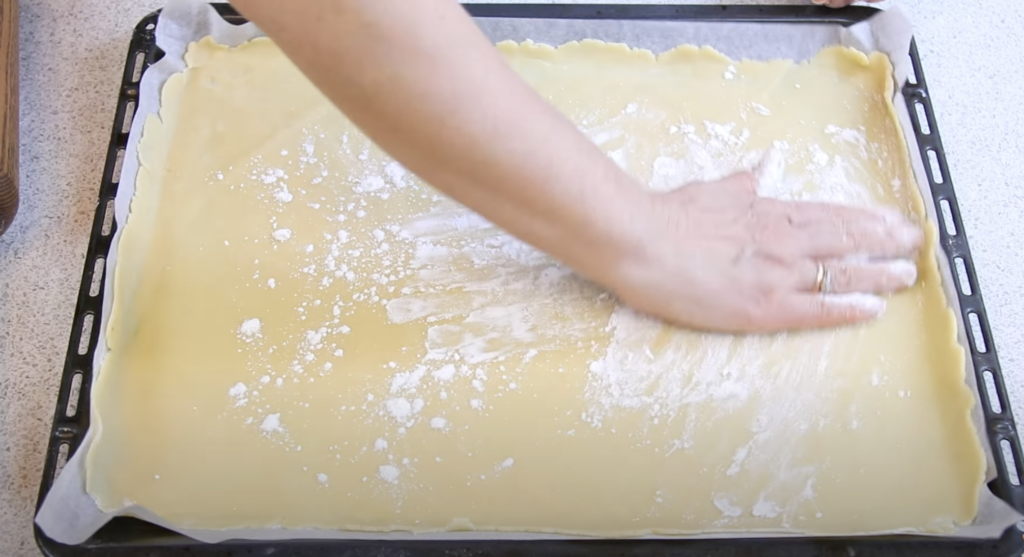 Jedną z połówek rozwałkuj na posypanej mąką stolnicy i umieść je na blaszce wyłożonej papierem do pieczenia.
