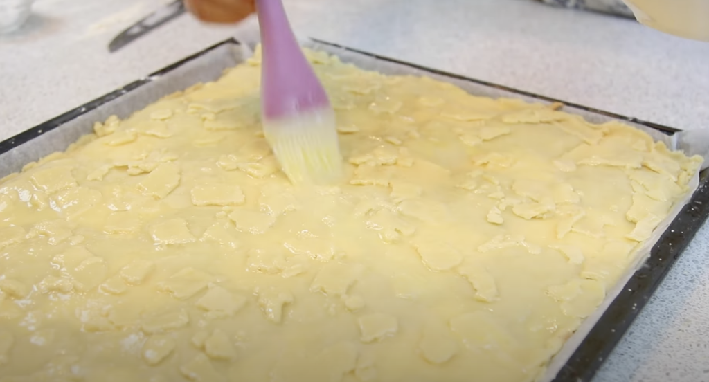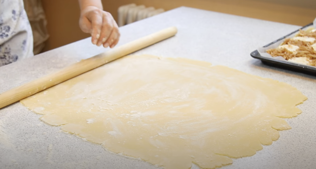 Pozostałą część ciasta rozwałkuj w taki sam sposób jak pierwszą, po czym delikatnie przenieś ją na wyłożone nadzienie z twarogiem, zakrywając je szczelnie. Wystające krawędzie przytnij nożykiem w razie potrzeby – możesz je ułożyć na wierchu ciasta jako dekoracja.
