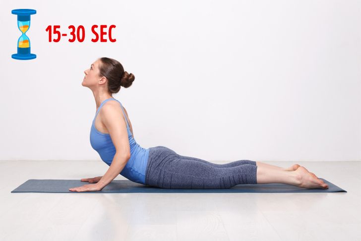 Do wykonania tego ćwiczenia należy położyć się na brzuchu i ułożyć ręce pod ramionami. Robimy wdech i unosimy ciało i prostujemy ramiona. Następnie zginamy się w dolnej części pleców i okolicach klatki piersiowej.