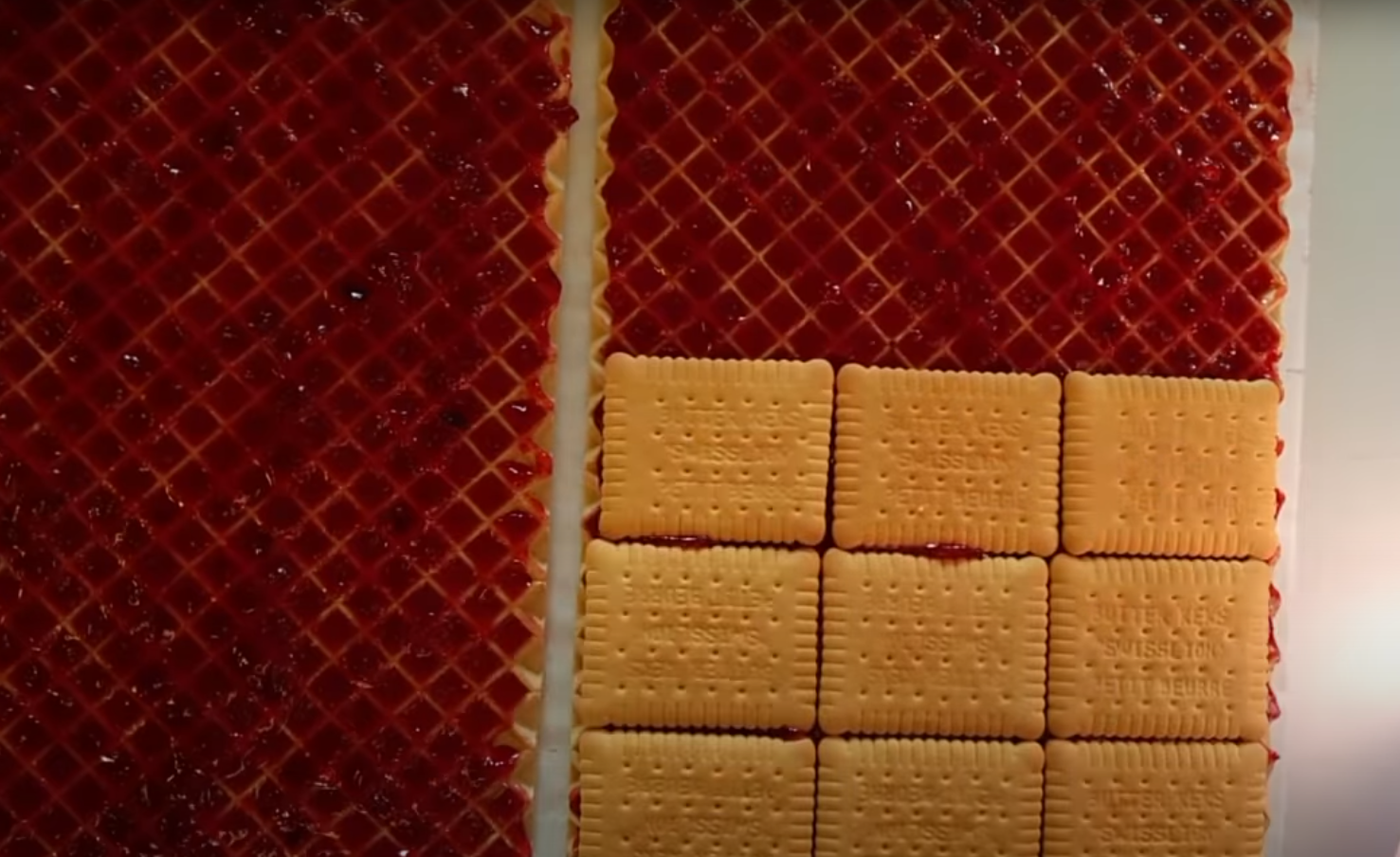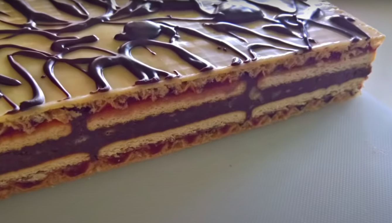 Weź duży wafel z herbatnikami i ułóż na nim masę, przykryj ją następną warstwą herbatników i połóż na Niego pozostały wafel z dżemem. Na przygotowanych waflach ustaw coś ciężkiego (np. karton mleka), włóż do lodówki na 2-3 godziny w celu schłodzenia deseru.