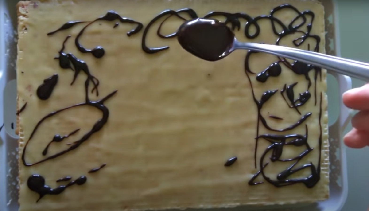Właśnie tak przygotowany lukier wylej na powierzchnię ciasta, a następnie rozpuść gorzką czekoladę z dodatkiem bitej śmietany i udekoruj górę deseru.