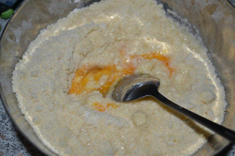 Do dużej miski włóż drobno posiekane masło. Dodaj do niego mąkę, 1 jajko i wodę. Mieszaj, aż składniki dokładnie się połączą.