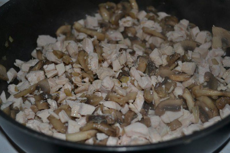 Posiekaj pieczarki i cebulę, po czym przez kilka minut smaż je na patelni. Filety z kurczaka ugotuj, pokrój w drobną kostkę i dorzuć do cebuli i pieczarek. Podsmażaj wszystko razem jeszcze przez 5-7 minut.