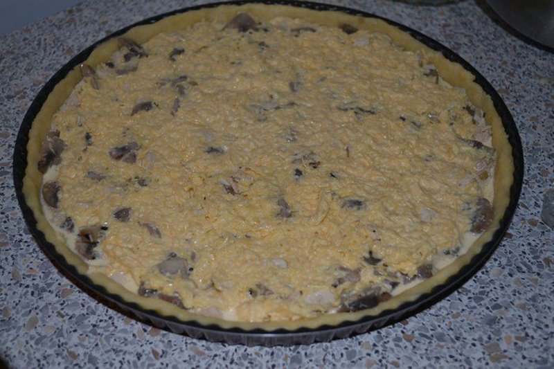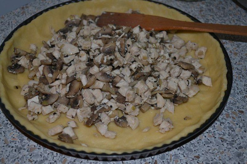 Wyjmij ciasto z lodówki. Rozmieść je równomiernie na dnie i bokach foremki. Na wierzch wyłóż podsmażone mięso, cebulę i pieczarki, a następnie wylej na nie przygotowaną wcześniej mieszankę śmietany, jajek i sera.