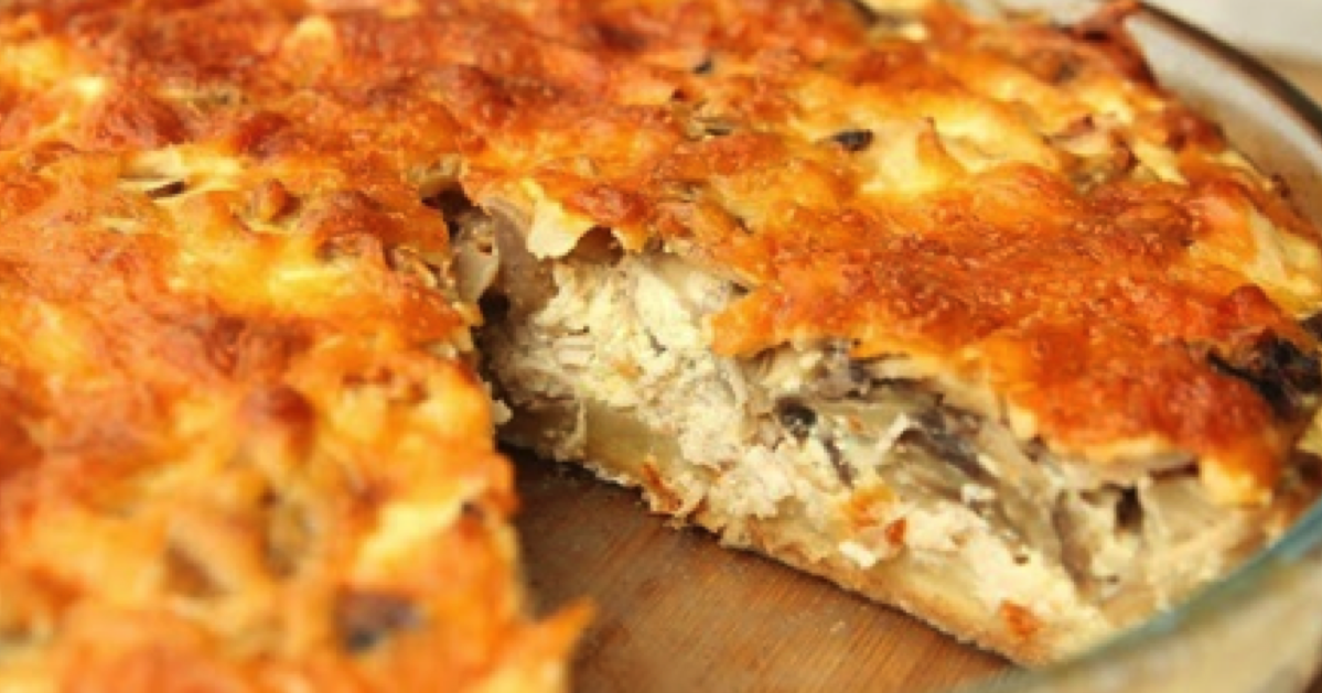 Wyjmij ciasto z lodówki. Rozmieść je równomiernie na dnie i bokach foremki. Na wierzch wyłóż podsmażone mięso, cebulę i pieczarki, a następnie wylej na nie przygotowaną wcześniej mieszankę śmietany, jajek i sera.