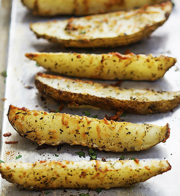 Lekko smarujemy formę masłem i kładziemy na niej przygotowane ziemniaki. Pieczemy w temperaturze 200 stopni aż do momentu, gdy nabiorą złoty kolor. Potrawa jest gotowa, smacznego!