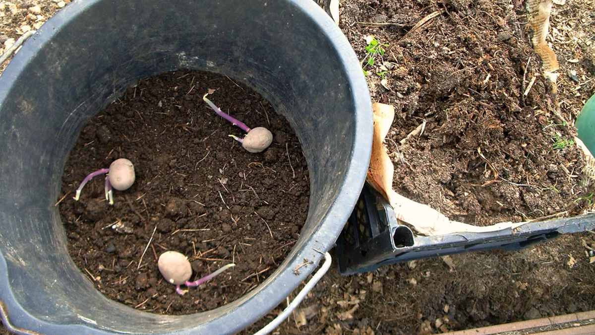 Dodaj 15 cm gleby do wiadra, umieść 2-3 bulwy i przykryj je kolejną warstwą gleby. Umieść wiadra na słońcu i poczekaj, aż liście wyrastają do wysokości 10-12 cm. Kiedy dojrzysz pierwsze listki, dodaj kolejną warstwę ziemi, tak że tylko wierzchołki będą widoczne. Powtarzaj te czynności, aż wiadro będzie pełne.